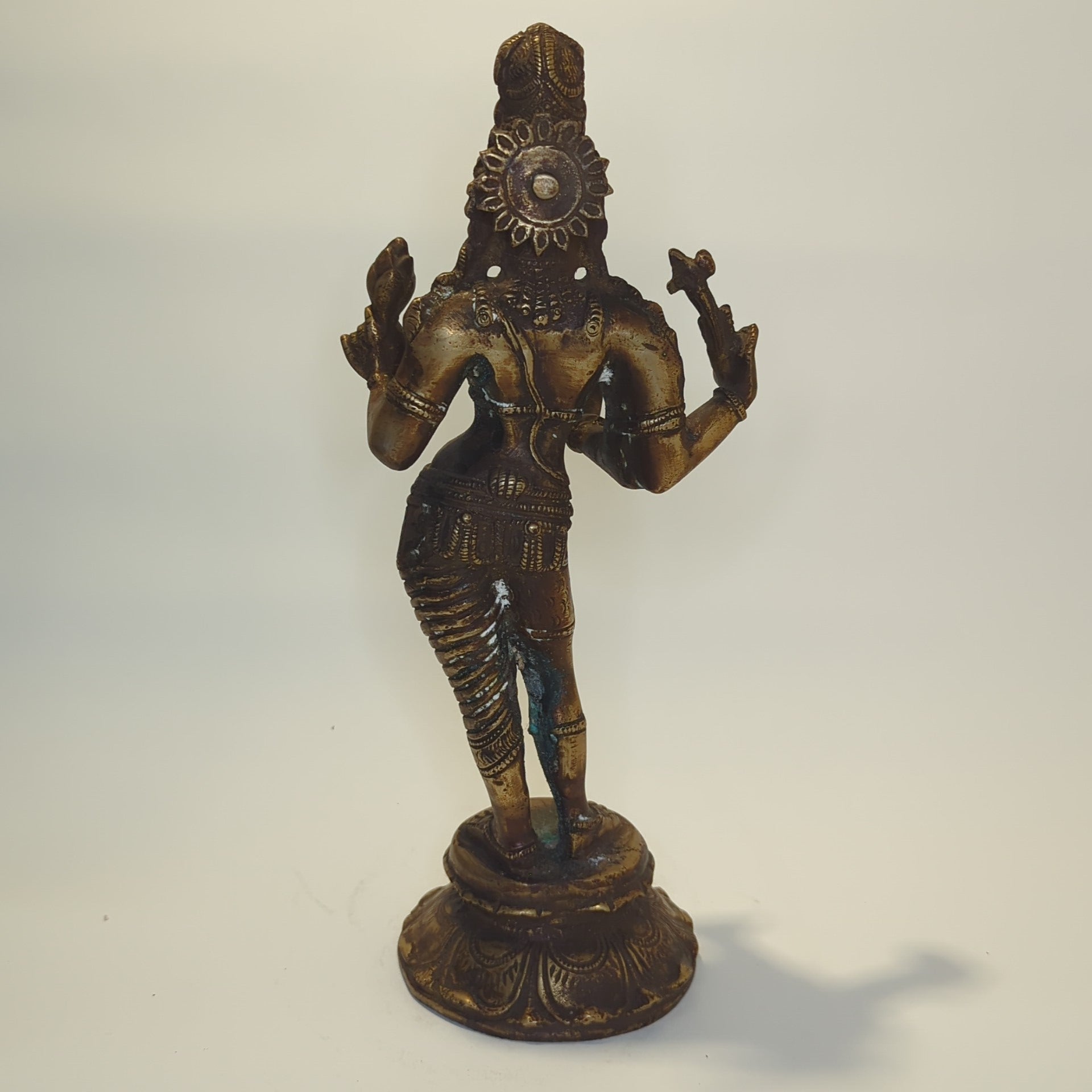 This impressive statue presents Ardhanarishvara , the androgynous manifestation embodying the divine unity of Shiva and Parvati . Crafted from solid brass , this handmade figure symbolizes the harmonious balance between masculine and feminine energies—the fundamental core of Hindu creation mythology. The detailed iconography masterfully depicts the merging of both deities in one form, making it a powerful centerpiece for home temples, pooja rooms, or as a treasured spiritual collectible. Standing approximately 30 cm tall (dimensions approximately 15 cm wide x 30 cm high x 10 cm deep), the statue exudes a majestic presence that blends spirituality with antique aesthetics.