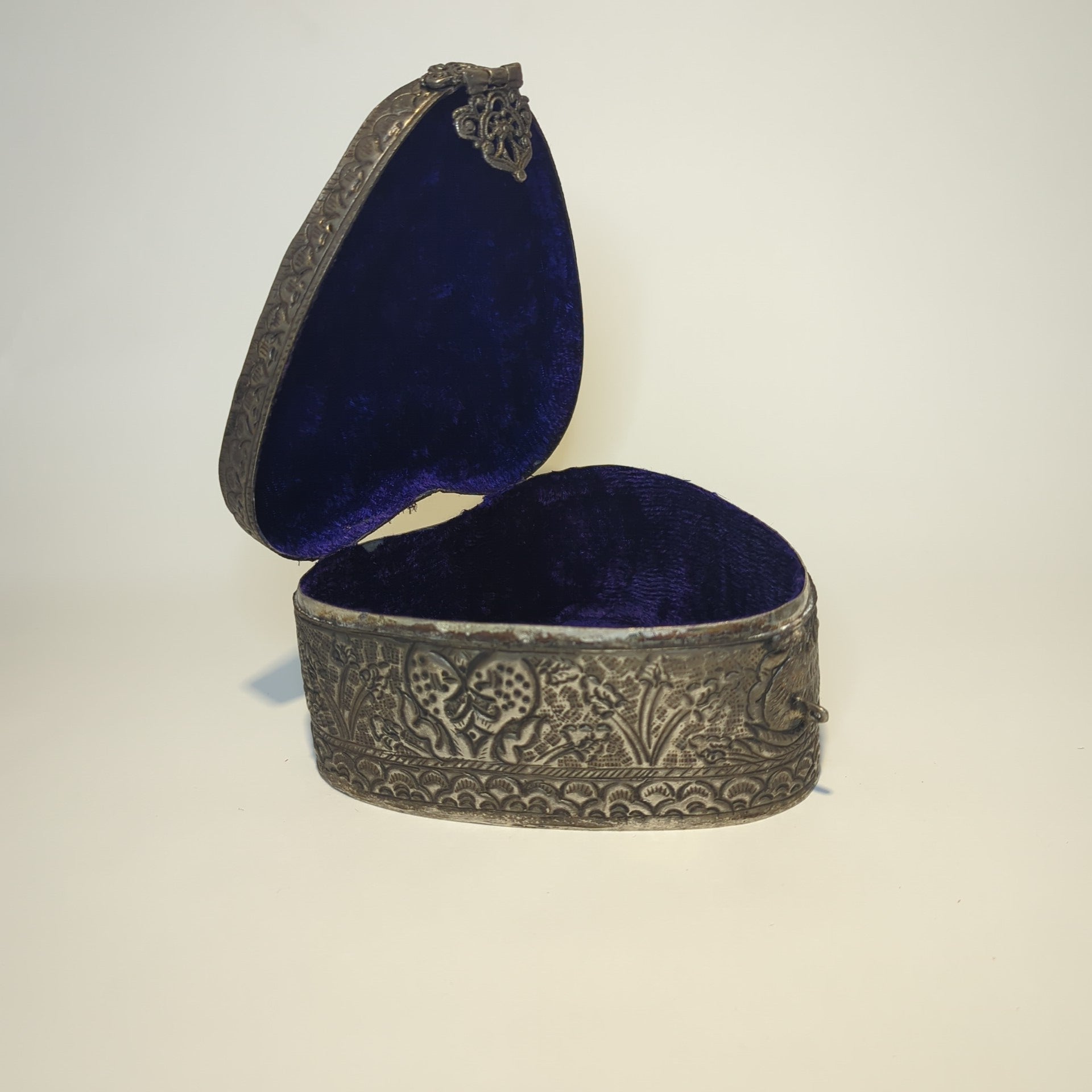 Heart-shaped hammered white metal box – blue velvet interior – handmade in India