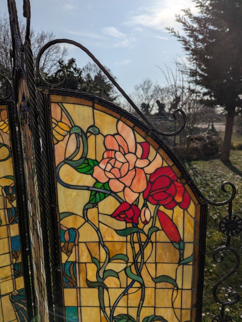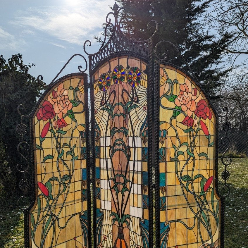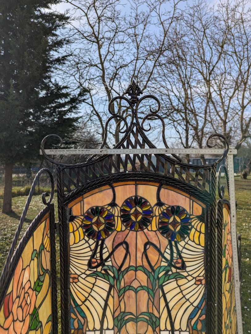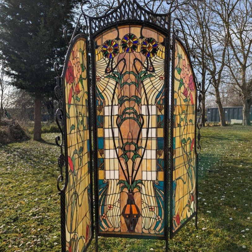 This elegant room divider is an exclusive work of art that combines the timeless beauty of Tiffany glass with the robustness of a wrought iron frame . The delicate leaded glass creates a captivating interplay of light and lends any room a refined, warm atmosphere. Weighing approximately 25 kg , the piece offers excellent stability while also serving as a functional element for stylish room partitioning.